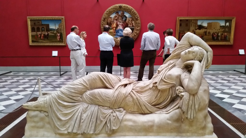 Voi che passate davanti all’Arianna dormiente mentre aspetta invano il suo Teseo e puntate diritto verso il Tondo Doni: è chiaro che ancora una volta il colore vi attrae; altrimenti almeno uno sguardo lo dedichereste a questa fanciulla che dorme: e invece siete voi che dormite, che non notate la sublime bellezza, l’abbandono di questa fanciulla che sembra così reale, così vero! Nulla, passate oltre anche se è in mezzo alla stanza, e non vi interessa neanche sapere chi sia, questa eroina del mito. Già, i miti: gli Uffizi sono zeppi di narrazioni mitologiche; e non mi riferisco solo al mito di Arianna, o a Eracle che uccide Nesso, o ad Apollo e Marsia, o ai Niobidi, o al Laocoonte divorato da un mostro marino o al bagno di Venere rappresentati nelle sculture antiche. Perché di miti greci è impregnata la pittura rinascimentale: e torna ancora una volta la nascita di Venere, nella quale la dea che esce dalla spuma del mare non è altro che la trasposizione pittorica rinascimentale di un mito greco. Cosa sarebbe la cultura occidentale senza i miti greci? Senza Zeus, Eracle, la Guerra di Troia, Ulisse e la sua Odissea? Sarebbe cosa ben diversa, e ben più povera. È dunque importante guardare ai miti antichi con attenzione, con partecipazione, con curiosità: andando oltre la favoletta per bambini scoprirete tante basi del vostro comune pensiero quotidiano. Il vostro comune sentire, che vi piaccia o no, affonda le sue radici nella cultura greca e romana, di cui noi, statue rese pallide dal tempo, ma non per questo inespressive, siamo testimoni perenni. Interrogateci: sono tante le storie che possiamo raccontarvi.
