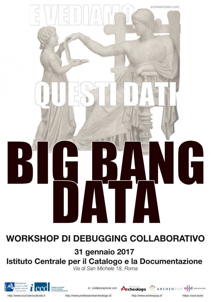 Da questa esperienza nasce Big Bang Data openICCD e workshop di debugging* colalborativo. Il 31 gennaio a Roma si parlerà delle problematiche legate al debugging e al riutilizzo dei dati aperti. In particolare durante la mattinata il workshop verterà sulle potenzialità, i limiti e il livello di usabilità dei dataset*, in un continuo scambio tra chi si occupa di liberare i dati, chi li utilizza per ricerca e lavoro e tutti i partecipanti alla giornata, mentre nel pomeriggio si parlerà di buone pratiche di riuso dei dati.
