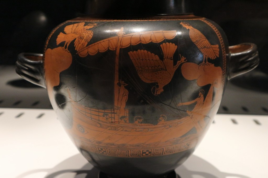 Una cesura importante nella storia della Campania e del Mediterraneo antico è la Battaglia di Cuma del 474 a.C. Il direttore di Pompei e curatore della mostra Massimo Osanna la definisce addirittura “l’11 settembre del mondo antico” per la portata e le conseguenze che ebbe. In questa battaglia gli Etruschi che erano installati nella regione e controllavano alcuni centri campani tra cui la stessa Pompei furono tremendamente sconfitti da Siracusa: il tiranno Ierone dedicò a Olimpia tre elmi come decima di guerra: sono presenti in mostra, accanto al notissimo vaso di Ulisse legato all’albero della nave che ascolta il canto delle Sirene.