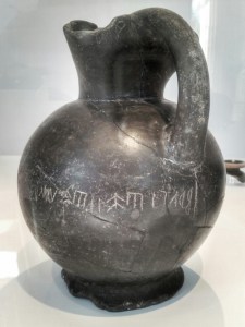 In mostra quest’aspetto viene illustrato attraverso oggetti che raccontano la classe della cavalleria campana, formata da giovani aristocratici e basata su una rigida formazione, su riti di iniziazione e cerimonie che si ritrovano tanto nella greca Cuma quanto a Capua, prima etrusca e poi italica: bronzetti e vasi che tradiscono origini diverse e diverse tecniche decorative raccontano gli esercizi, i combattimenti di questa classe elitaria. Ma l’aspetto più significativo di questo melting pot culturale è costituito dai vasi parlanti, iscritti, provenienti dai corredi funerari della necropoli di Nuceria (Nocera, recentemente venuti in luce) della metà del VI secolo a.C.: alcuni, in bucchero, sono in lingua etrusca, altri in ceramica greca, recano il nome del proprietario in lingua greca; tra tutti, una brocca per il vino, un’oinochoe, in bucchero ha un’iscrizione in paleoitalico: Bruties esum. Questo potrebbe essere benissimo l’oggetto più significativo di questa temperie culturale.