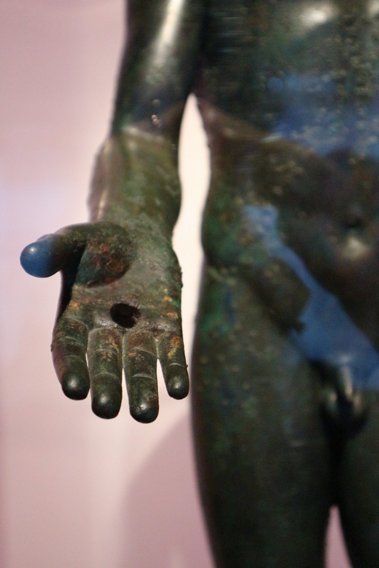 Arriviamo finalmente all’età romana. E ci stupiamo nel vedere che con Roma cambiano gli equilibri e la cultura greca diventa oggetto di una passione antiquaria. A Pompei giunge l’eco della rivoluzione culturale in senso ellenizzante che era stata fatta propria dalla classe senatoria di Roma. Con la differenza che Pompei era da sempre permeata di cultura greca. In ogni caso, ricche case pompeiane vengono abbellite con copie di opere di arte greca o con oggetti di vero e proprio antiquariato. Troviamo statue di Afrodite Sosandra a Baia, mentre a Pompei nella Casa del Menandro, del cui giardino è offerta una splendida restituzione virtuale, Apollo diventa un mero lampadoforo in bronzo: è la statua-locandina della mostra, ed è il punto di arrivo di un rapporto plurisecolare tra Pompei e i Greci.
