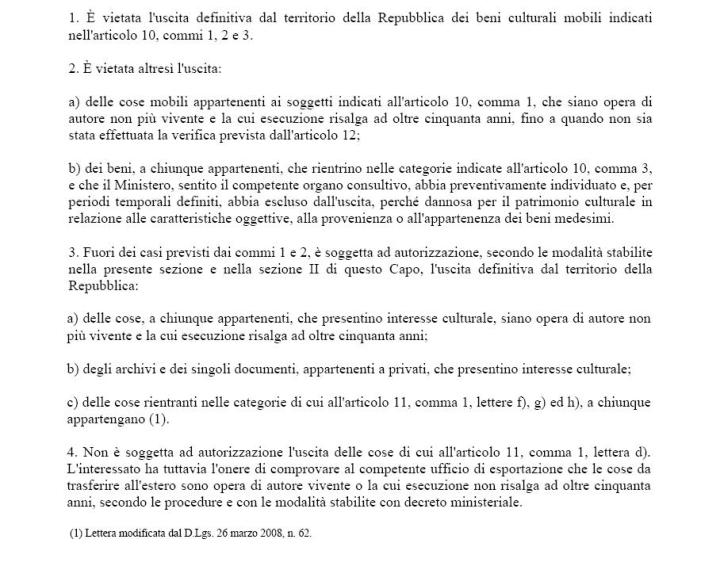 L’articolo delinea tutte le categorie di beni culturali dei quali è vietata l’uscita definitiva, di quelli soggetti ad autorizzazione e di quelli per i quali invece l’autorizzazione non è necessaria: