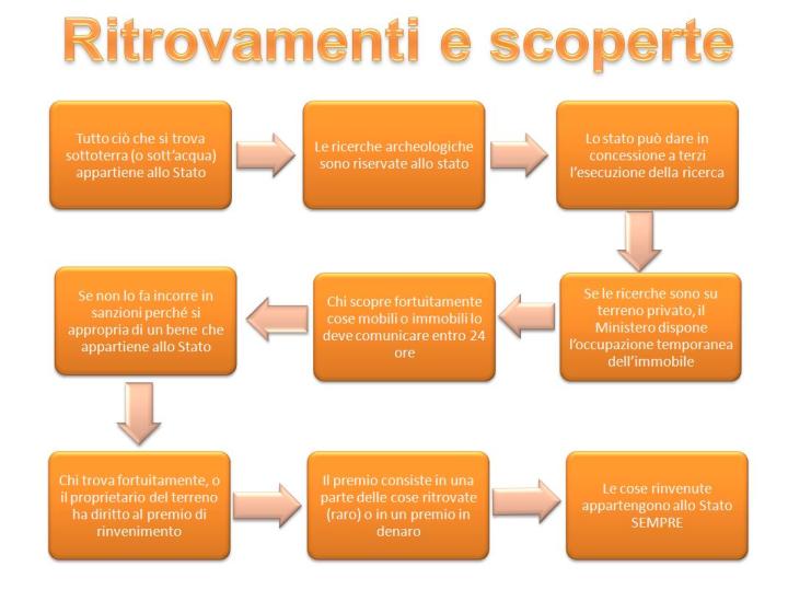 In sostanza lo Stato ha la riserva in materia di ricerche archeologiche, perché tutto ciò che si rinviene nel suolo (o nei fondali) è di proprietà dello stato: se immobile diventa proprietà demaniale, se mobile viene acquisito al patrimonio indisponibile (artt. 822 e 826 del Codice Civile). Le ricerche archeologiche sono dunque riservate allo stato e le cose ritrovate appartengono allo stato. Questo succede perché è lo Stato che assume in sé le funzioni di tutela e l’unico modo per poter tutelare le ricerche volte al ritrovamento di nuovi beni culturali è averne il controllo.