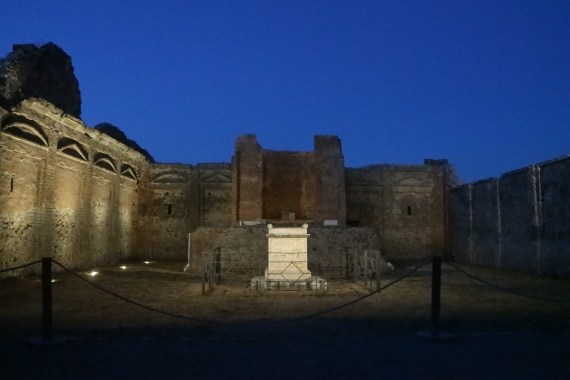 Il tempio del Genius Augusti, affacciato sul foro di Pompei, illuminato