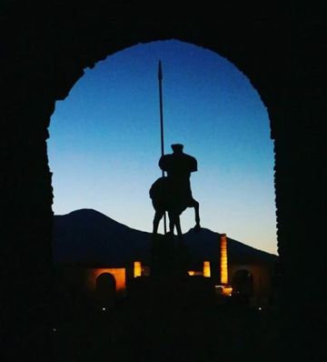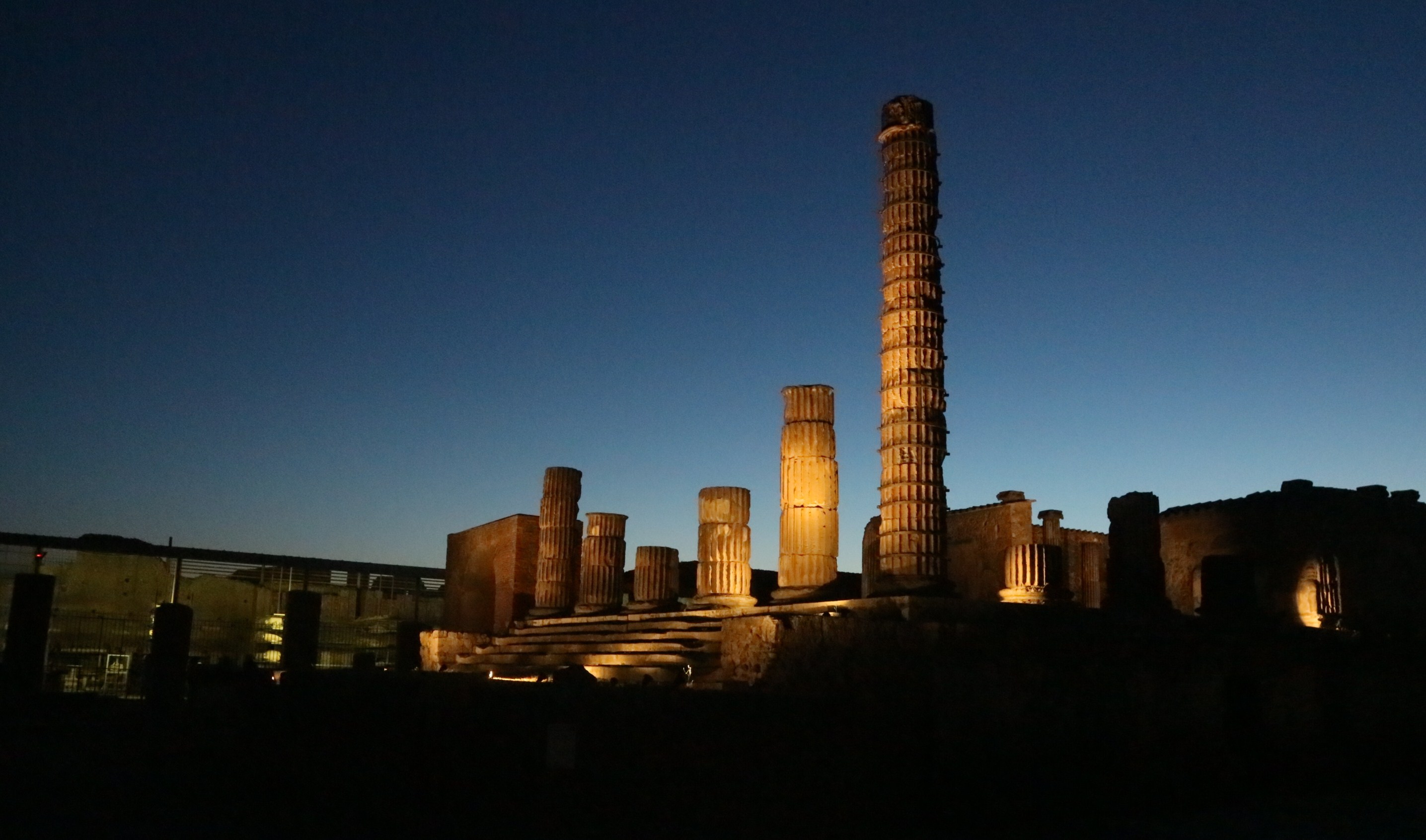 Il sole, a Pompei, tramonta da qualche parte dietro il Vesuvio. La cresta montuosa si incendia per un attimo, poi all’intorno, scende il crepuscolo, cala la notte sulle rovine della città antica.