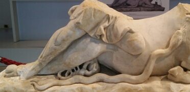 Ecco che nella nostra storia intervengono due ragazzini, che giocano nei pressi dello scavo in corso, in mezzo alla terra di risulta scavata dagli archeologi. Ogni tanto trovano una tessera di mosaico, ogni tanto qualche coccio, ma una volta trovano un pezzo di marmo bianco. Lo sollevano, è pesantissimo. Lo trascinano fin sulla soglia di casa e lo lavano. Appare sotto i loro occhi il corpo di un toro con un serpentello lungo un fianco e una gamba umana poggiata sulla parte posteriore: manca la testa del toro, e manca la parte superiore della figura umana, ma non ci vuole molto per gli archeologi della Soprintendenza, chiamati subito dal babbo di uno dei ragazzini per verificare il ritrovamento, per capire che si tratta di una statua di culto del dio Mithra.