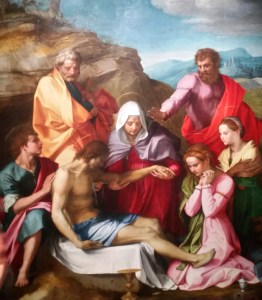 • Andrea del Sarto, Compianto sul Cristo morto. Chiamato anche “Pietà di Luco” questo dipinto fu realizzato dal pittore fiorentino (che per qualche tempo, tra l’altro, dimorò in via Gino Capponi, accanto alla chiesa della SS. Annunziata per la quale lavorò e accanto al Museo Archeologico Nazionale di Firenze dove invece lavoro io) per il monastero camaldolese di San Pietro a Luco del Mugello, località fuori città nella quale il pittore si era rifugiato per sfuggire alla peste. Ed ecco un tipo di viaggio tutto particolare: la fuga da un focolaio di malattie, la residenza in un posto salutare. Come lui, nel 1523 lasciarono Firenze per colpa della peste numerosi artisti che elessero a dimora altre destinazioni, dove ugualmente lavorarono. A Luco, le monache del convento di San Pietro gli commissionarono l’opera, desiderose di possedere un dipinto di un artista che godeva di grande fama.