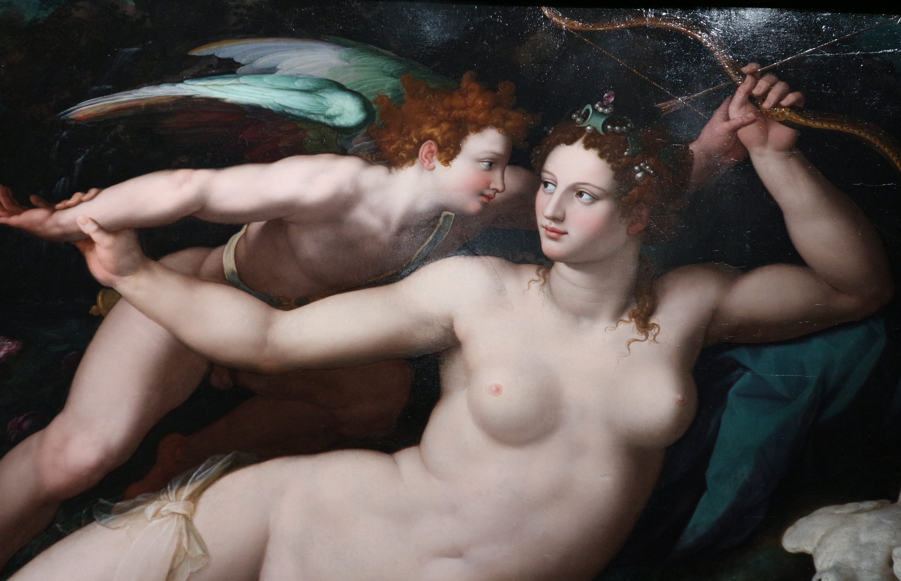• Alessandro Allori, Venere e Amore. Questo dipinto, dolcissimo, fu realizzato per Lodovico Cattani da Diacceto, fiorentino che viveva a Lione. Costui divenne uno dei banchieri più potenti di Francia grazie alla protezione di Caterina de’ Medici e la sua stella fu sempre così fortunata da fargli acquisire il titolo di conte di Châteauvillaine nel 1578 e da fargli sposare la figlia del Duca d’Atri, consentendogli l’ingresso a tutti gli effetti nella nobiltà francese. Già dal 1571, comunque, si era trasferito a Parigi dove aveva acquistato, nel Marais, in Rue Vieille du Temple, un palazzo enorme che aveva ornato di antichità e opere d’arte. Il Marais fu per lungo tempo il quartiere privilegiato per le residenze nobiliari degli aristocratici parigini: tutt’oggi i grandi palazzi che si incontrano nelle strade strette di questo caratteristico quartiere di Parigi sono le antiche dimore dei grandi casati. La tavola di Venere e Amore fu quindi portata a Parigi nella residenza del Cattani. Ma come si sa, la fortuna gira e così già nel 1586 il banchiere fu costretto a vendere il Palazzo e le opere che lo adornavano. Per alterne vicende di passaggi di proprietà, che portarono il dipinto fino a Londra, alla fine la tavola si fermò a Montpellier, dove si trova oggi.