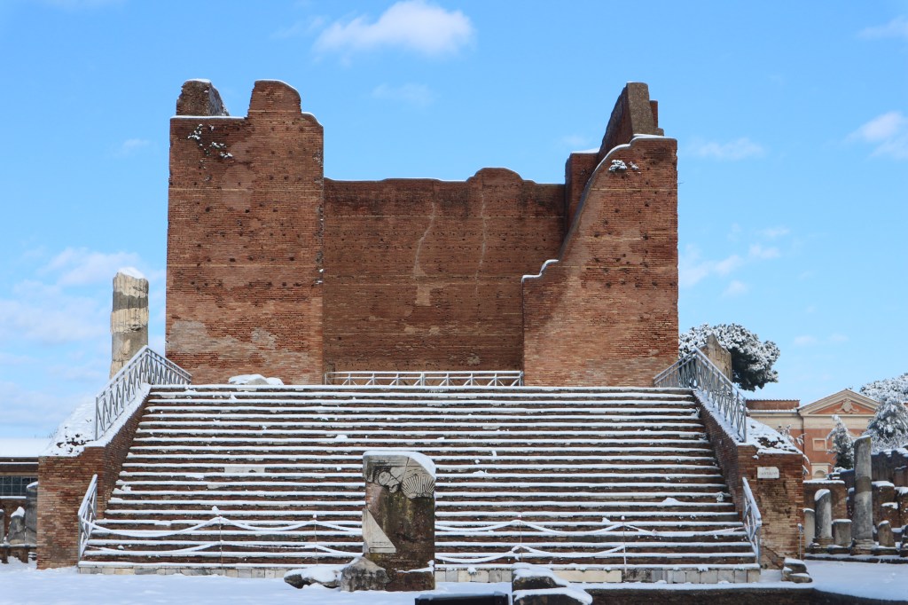Tornati sul Decumano, dal pronao sopraelevato del Tempio Rotondo si gode di una bellissima vista sul Capitolium e sul foro innevati. In età severiana, quando fu costruito, non era così: il tempio rotondo aveva davanti a sé una piazza quadrangolare chiusa, cosicché appariva un santuario a sé stante. Inoltre in direzione del foro sorgeva la Basilica, della quale oggi rimane a malapena il basamento e poco altro, modificando totalmente la percezione degli spazi che abbiamo noi.