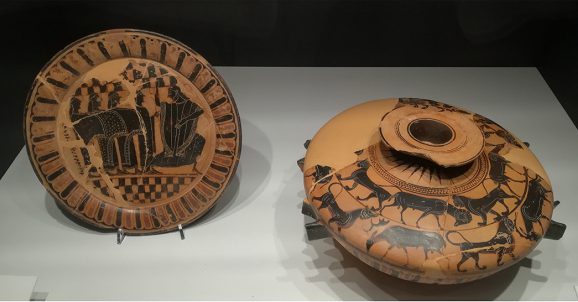 Nella sala, poi, trovano posto lungo le pareti altri reperti. Uno lo conosciamo già: è il famoso sgabello che distrusse il vaso che fin dall’epoca fu identificato da un cartellino, come corpo del reato, probabilmente, e che da oggetto di arredo, funzionale, di un museo è diventato oggetto da esporre in un museo. Gli altri due oggetti sono due vasi che, pare, sono stati rinvenuti nella stessa tomba di Chiusi: si tratta di un piatto con rappresentato Paride che fugge davanti alla non simpatica prospettiva di dover decidere quale tra Atena, Era e Afrodite sia la dea più bella (un piccolo presentimento delle sventure che lo avrebbero colto evidentemente lo aveva avuto!) e di una lekanis, una bacinella con due serie di animali a figure nere, felini e caprini e cervidi alternati. I due vasi si daterebbero all’incirca agli stessi anni del Vaso François.