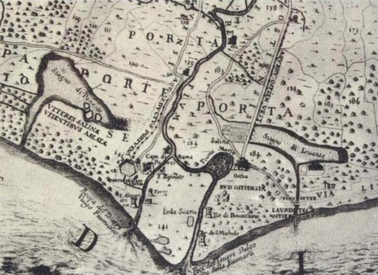 In età paleocristiana sorge la basilica di Pianabella intorno alla quale si aggrega un piccolo abitato; stessa cosa accade a Sant’Aurea, che diventa poi il nucleo da cui ha origine nel IX secolo Gregoriopoli, il borgo voluto da papa Gregorio IV destinato a diventare nel tempo un borgo fortificato strategico, sull’ansa del Tevere. Il castello di Giulio II doveva avere un approdo: le fonti ci parlano di almeno due papi, uno in fuga da Roma verso il mare, l’altro in arrivo a Roma, che si fermarono a Ostia per cambiare mezzo di navigazione. Le barche che risalivano la corrente ricorrevano al sistema dell’alaggio, ovvero il traino da parte di buoi. Il borgo di Ostia, grazie al suo approdo, diviene un fiorente luogo di arrivo e scarico di merci, con una dogana funzionante e diversi magazzini. Uno di essi è rimasto nella toponomastica: è il Casone del Sale, magazzino evidentemente adibito alla conservazione del sale estratto nelle saline dello stagno di Ostia. Queste si esauriscono tra il Settecento e l’Ottocento, per problemi di manutenzione dei canali di approvvigionamento dell’acqua salata.