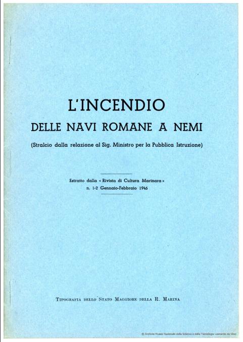 “L’incendio delle navi a Nemi” pubblicato come stralcio della Rivista di Cultura Marinara del gennaio-febbraio 1946, riporta la relazione fatta all’indomani dell’incendio e dell’indagine che ne seguì, raccogliendo i racconti dei testimoni: i custodi del Museo delle navi romane, cacciati dalla loro postazione dai Tedeschi che vi avevano cercato riparo. Quegli stessi Tedeschi che poi avrebbero appiccato l’incendio.
