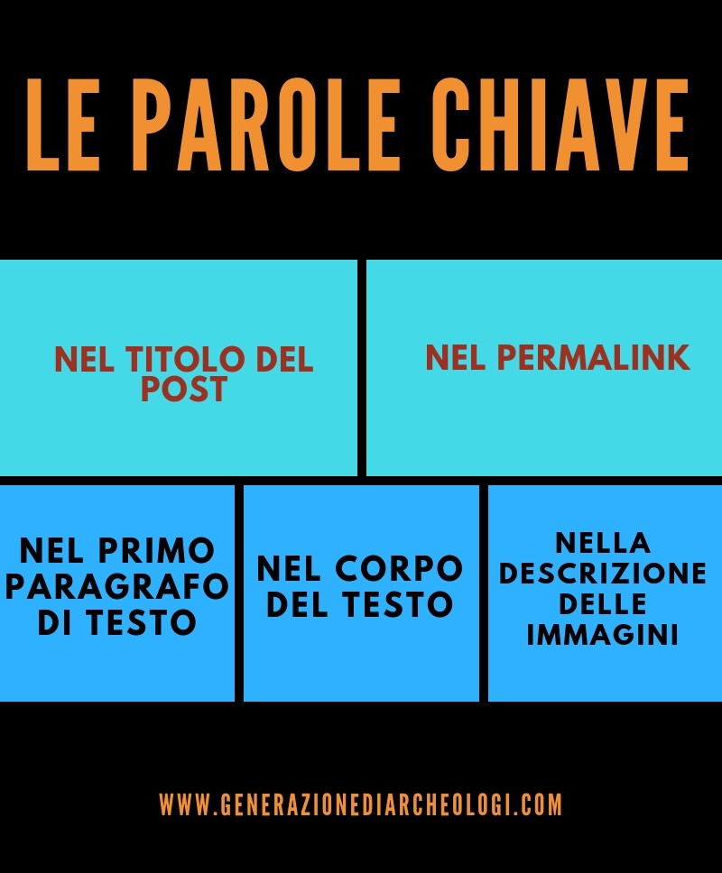 Le parole chiave sono importanti. Anzi no, sono fondamentali. Sono quelle che consentono a chi cerca un determinato argomento di trovarti e a te di farti trovare da chi cerca quel determinato argomento. Un post può essere indicizzato tramite più di una parola chiave, ma l’importante è che la parola chiave principale si trovi già nel titolo del post, si trovi quindi nel permalink, cioè nella url relativa a quel post, nel primo paragrafo di testo e svariate volte nel corso del testo. Infine, deve ricorrere anche nella descrizione delle immagini.
