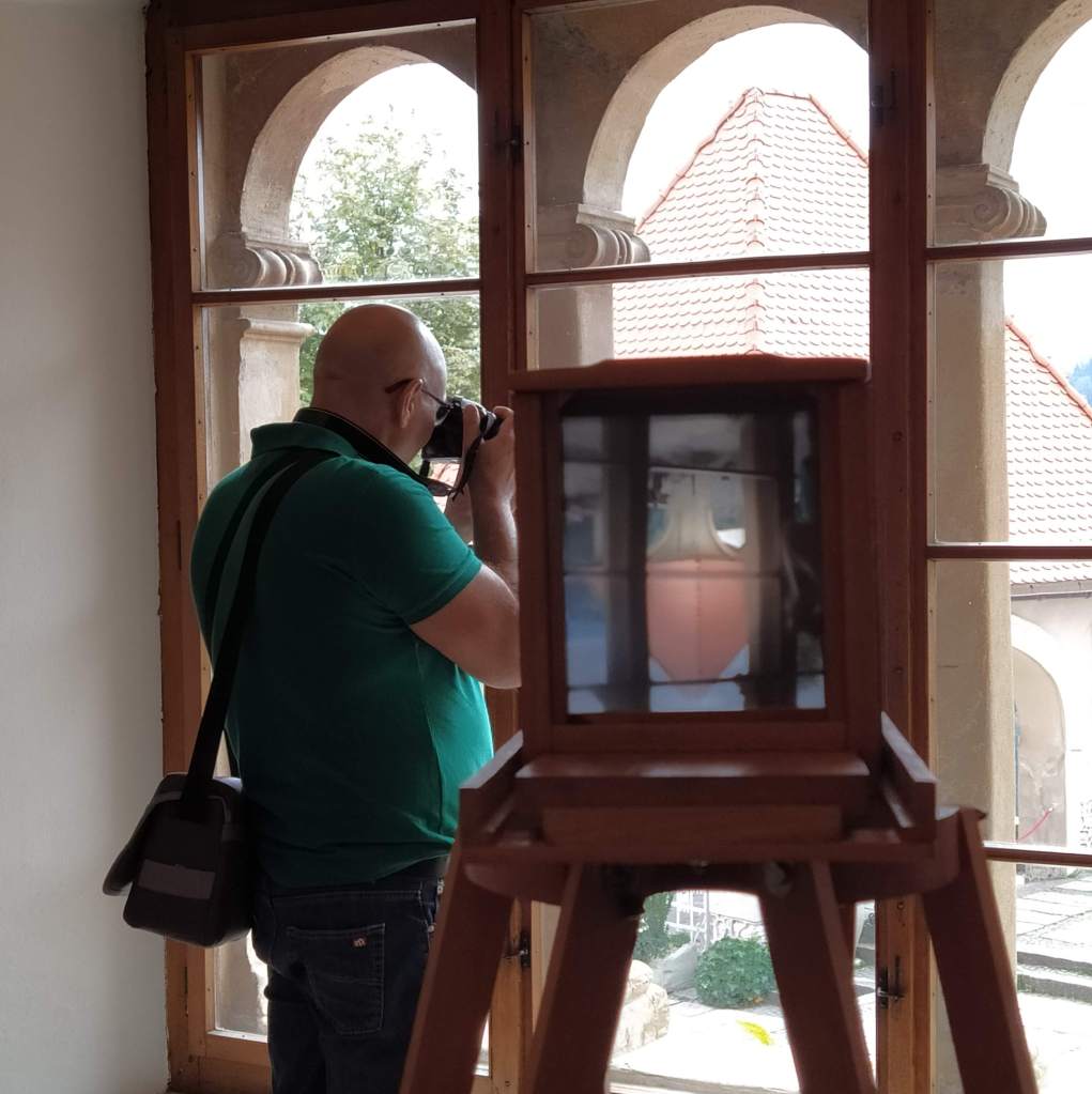 Una piccola saletta racconta di Janez Puhar, fotografo sloveno che negli anni in cui si andavano sperimentando le prime tecniche fotografiche, conduceva esperimenti sull’impressione fotografica su lastra di vetro. In quegli anni, siamo intorno al 1840, molti fotografi in Europa si stanno dando da fare dopo l’invenzione del dagherrotipo. Janez Puhar tra le montagne della Gorenjska inventa il suo sistema per impressionare le lastre di vetro: chiamerà il suo metodo Puharotype, dal suo cognome. Il processo preciso non è del tutto chiaro, perché il nostro fotografo non ha lasciato traccia scritta puntuale del suo metodo. Quello che si sa è che poteva stampare su platino e che proiettava le fotografie con una lanterna magica. Diciamo che c’era un po’ di alchimia nella sua tecnica fotografica! Puhar nacque a Kranj, cittadina a metà strada tra Lubiana e Bled. Proprio a Bled Puhar ebbe modo di sperimentare la sua tecnica fotografica, ritraendo anche i turisti europei che proprio da metà Ottocento cominciavano a scoprire il lago quale meta per la villeggiatura. Ciò fece la fortuna di Puhar, che ebbe così modo di esporre le sue fotografie in tutta Europa e persino in America. Tutto ciò è raccontato nel museo del Castello di Bled, mentre una macchina fotografica del tipo “campagnola” punta il suo obiettivo verso una finestra che dà sul lago.