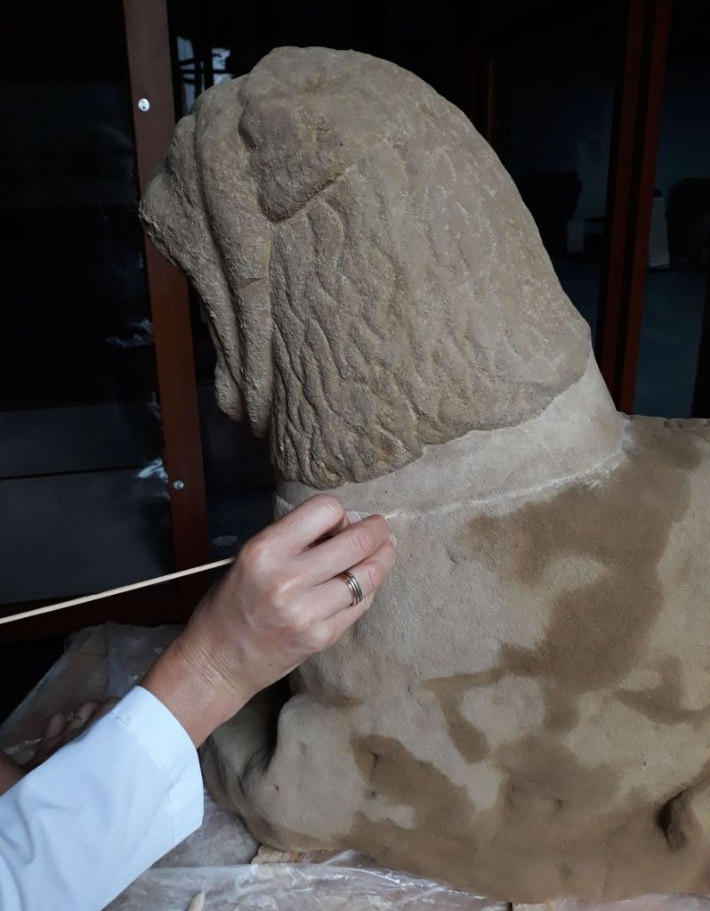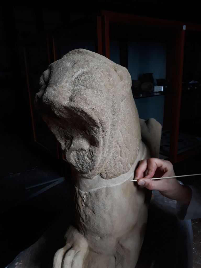L’intervento di restauro è stato finalizzato alla restituzione del maggior grado possibile di integrità alla scultura, attraverso il rimontaggio delle due parti della statua tramite integrazione reversibile della parte mancante tra il corpo e la testa, prive di punti di contatto. Il progetto della struttura metallica di sostegno è stato interamente ideato e realizzato dal laboratorio di restauro del museo, mentre alla restauratrice Cristina Del Gallo è stato affidato l’intervento di pulitura e consolidamento. A seguito delle esplorazioni preliminari e delle indagini multispettrali, il progetto di restauro ha preso avvio con ipotesi di ricostruzione grafica per determinare la posizione corretta della testa da ricollocare, prendendo come punto di partenza la scriminatura della criniera. Per sostenere il capo è stato quindi realizzato un sostegno in acciaio inox, costruito e modellato in uno spessore idoneo a simulare la corretta altezza del collo.
