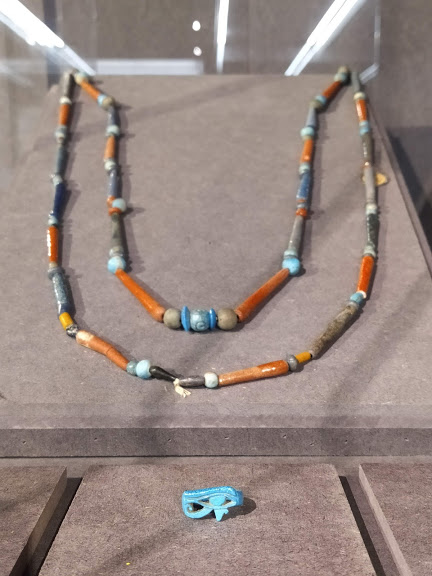 Nei corredi femminili colpiscono l’immaginazione i gioielli, solitamente in oro, fayence blu, pietra bianca: collane, anelli, pendenti. I gioielli esposti in mostra risalgono al Nuovo Regno (1550-1070 a.C.) e rendono l’idea del gusto della loro proprietaria.