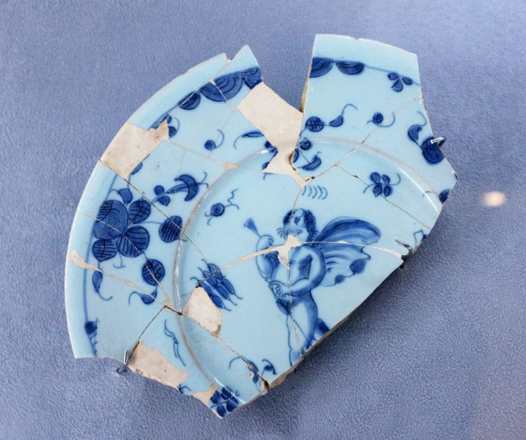 Le ceramiche sono splendide. Abbiamo piastrelle in ceramica bianca e blu, brocche, piatti decorati, fondi di ciotole decorate a foglie gialle e blu, abbiamo persino un piatto in ceramica di produzione ligure, decorato con un puttino centrale.