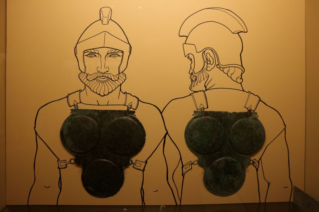 Pontecagnano è il luogo più significativo, ma la presenza etrusca nell’area campana è diffusa a macchia d’olio. In mostra, oltre a corredi sepolcrali di alto rango (fibule in bronzo, ma anche oggetti d’importazione) e all’armatura in bronzo di soldato (410-390 a.C.) dalla Necropoli Orientale di Pontecagnano, sono documentati anche corredi da Nola e da Nocera Superiore. La semplice eppure splendida coppa con l’iscrizione Ariston ben leggibile è eccezionale.