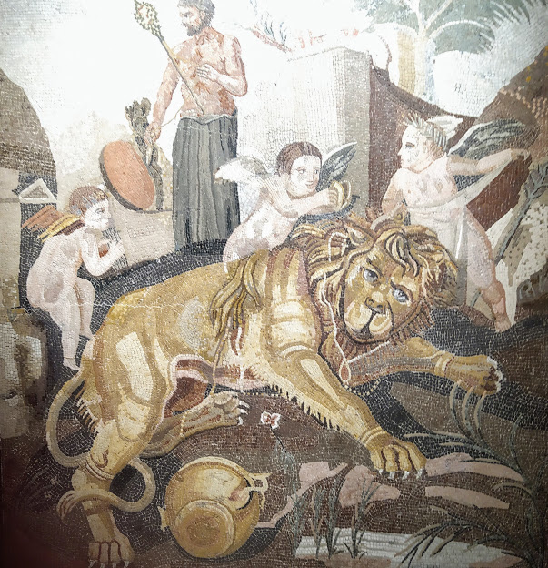 Questo mosaico è un emblema, ovvero il riquadro centrale di un pavimento a mosaico. In esso è raffigurato un leone in riposo che però è costretto a subire i dispetti di alcuni amorini. Il povero leone è mezzo ubriaco (lo vediamo dal cratere rovesciato davanti a lui e dall’espressione spersa dei suoi occhioni) e gli amorini ulteriormente lo incantano col suono di strumenti musicali. Questa scena, da ricondurre al mondo dionisiaco, è stata interpolata nel Settecento con l’inserimento di quella figura maschile in abiti femminili che vorrebbe richiamare Ercole presso la regina Onfale. Ma si tratta di un’invenzione che nel mosaico originale con tutta probabilità non era presente.