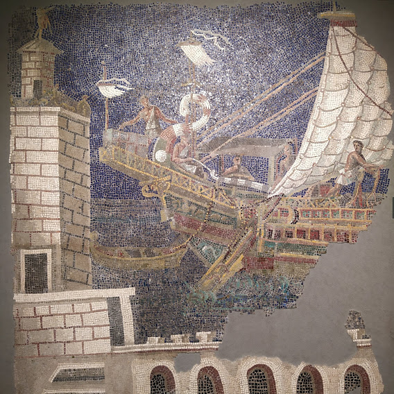 Tornando al mosaico con nave e faro che decorava una parte del grande ninfeo, esso raffigura probabilmente il porto di Alessandria, sia per la struttura del faro che per il molo su arcate. Una nave a vele spiegate esce dal porto: che rappresenti una nave oneraria col suo carico di grano destinato a Roma? Molto probabile, anzi certo: sotto i Severi il grande Portus di Roma Imperiale, voluto da Claudio a nord della foce del Tevere e ampliato da Traiano con la realizzazione di un bacino esagonale interno, fu ulteriormente potenziato proprio per accogliere sempre più navi e merci provenienti da ogni parte del Mediterraneo, Africa in particolare.