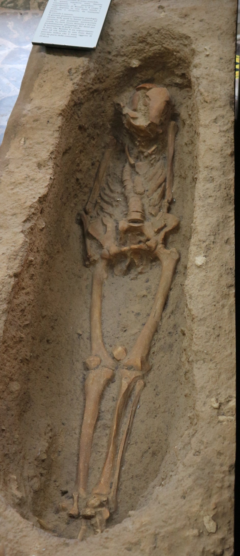 La sepoltura 8 ha un’altra storia interessante: rinvenuta all’interno della grotta, l’individuo che l’ha occupata ha vissuto fino ai 30 anni, dunque era a tutti gli effetti un anziano nella società del tempo. Quest’individuo maschile sicuramente era stato dedito alla caccia come tutti i maschi del clan e subì diverse ferite durante le sue missioni, l’ultima delle quali, qualche anno prima della morte, lo rese paralitico, con schiacciamento delle vertebre tale da non potersi più muovere. Nonostante l’incidente davvero grave, la sua comunità si prese cura di lui. Al tempo stesso lui si rese utile al clan e anche se non poteva più cacciare si mise a realizzare strumenti in pelle o corda: questo ci racconta la fortissima usura dei denti. Quando morì, fu sepolto in una fossa terragna stretta e profonda, coperto da moltissime pietre.