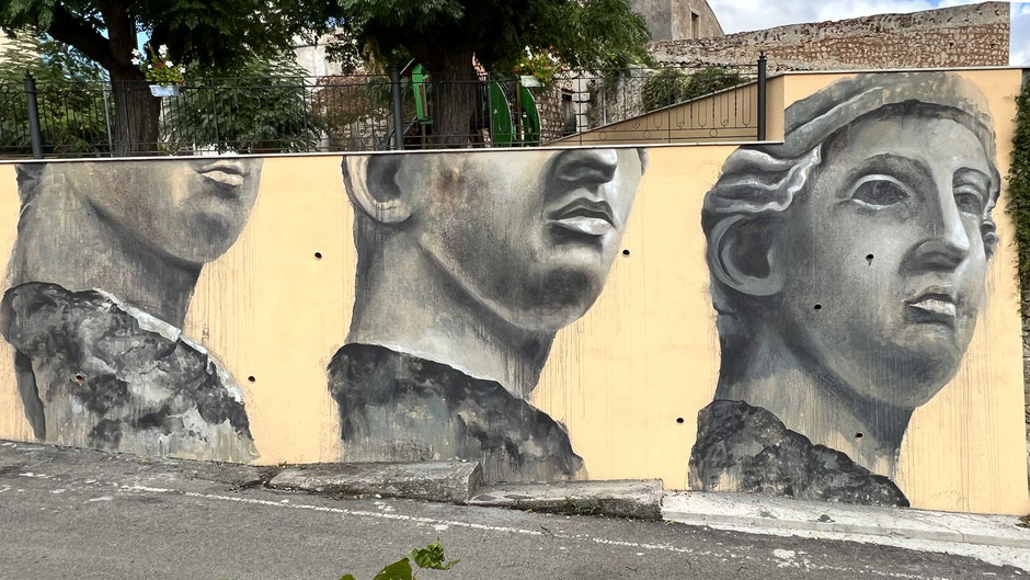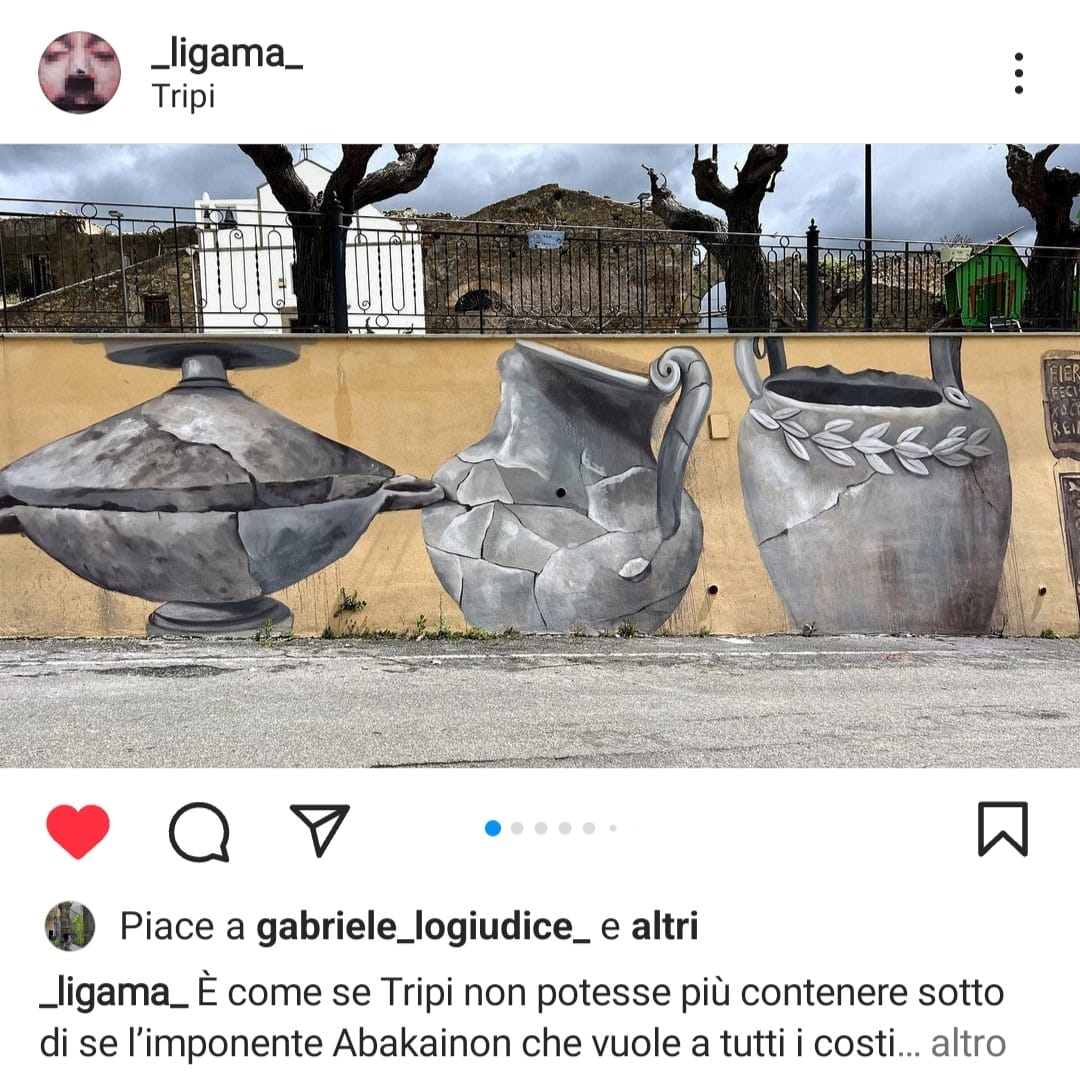 Scopro, poi, ritornando sul sito web di Ligama, che già nel 2022 l’artista aveva realizzato a Tripi un altro murales di grande formato su un muro: sul muro, che è un muro di terrapieno lungo la strada che scende (o che sale) dal paese, appare la stessa testa di statua reiterata tre volte, sfruttando l’andamento e l’innalzarsi costante del muro: dapprima della testa si vede solo il collo e la bocca, poi si aggiunge anche il naso e infine possiamo vederla interamente. L’opera si intitola “Il gigante di Abakainon” e ancora una volta si pone come un’opera di valorizzazione urbana con un occhio al patrimonio culturale e archeologico del territorio.