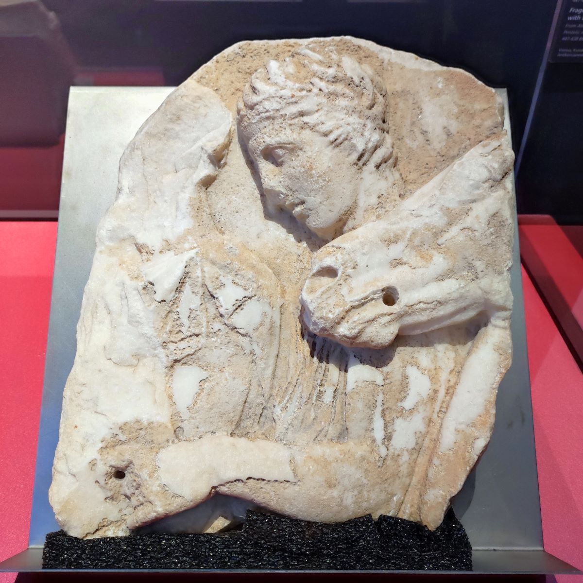 Dove ho trovato Fidia, ancora? Nei rendiconti scolpiti su marmo delle spese sostenute da Atene per l’acquisto di carbone, legna da ardere, rame, piombo, argento, nonché per il pagamento dei salari necessarie per la realizzazione dell’Athena Promachos. Ecco, vedere quei conti – frammentari ormai – è una dimostrazione molto concreta di come funzionavano le pubbliche commissioni di monumenti e di statue di culto, come nel caso dell’Athena Promachos. Anche per il Partenone abbiamo i rendiconti di spesa relativi a una statua in avorio e oro: avete capito di chi si tratta, sì? Dell’Athena Parthenos. Questi documenti erano pubblici, scolpiti su marmo ed esposti, nel caso dell’Athena Parthenos, all’interno del Partenone stesso. Ecco, sono documenti come questo, un piccolo ma significativo frammento esposto in mostra, che mi avvicinano di più a Fidia, al suo lavoro quotidiano, al suo confrontarsi non solo con l’esercizio del suo estro artistico, ma anche con il suo essere imprenditore, con i conti che non tornano, con la gestione di una bottega nella quale lavorano altri scultori che devono essere pagati, ma anche seguiti e formati, perché lo stile parli un linguaggio univoco e perfettamente riconoscibile.