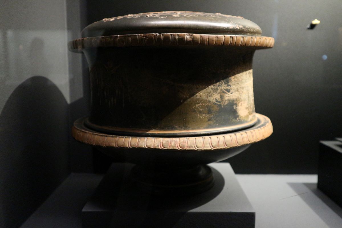 Tra gli oggetti in mostra a tal proposito colpisce una pisside attica a vernice nera che porta a rilievo sul corpo la riproduzione di una lunga collana alla quale sono collegati numerosi pendenti, veri e propri amuleti che dovevano proteggere la giovane defunta nel passaggio nell’Aldilà: delfino, locusta, cicala, fiori, crescenti lunari. Quest’oggetto, la cui provenienza è sconosciuta, ma fa parte della collezione del Benaki Museum, si data al 330-320 a.C.