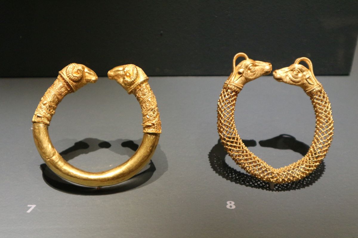 Bracciali terminanti a protome di ariete e di capra. L’uno si data alla fine del IV secolo a.C. (provenienza sconosciuta, collezione Benaki Museum), l’altro si data tra il 300 e il 250 a.C. (da Europos, Macedonia)