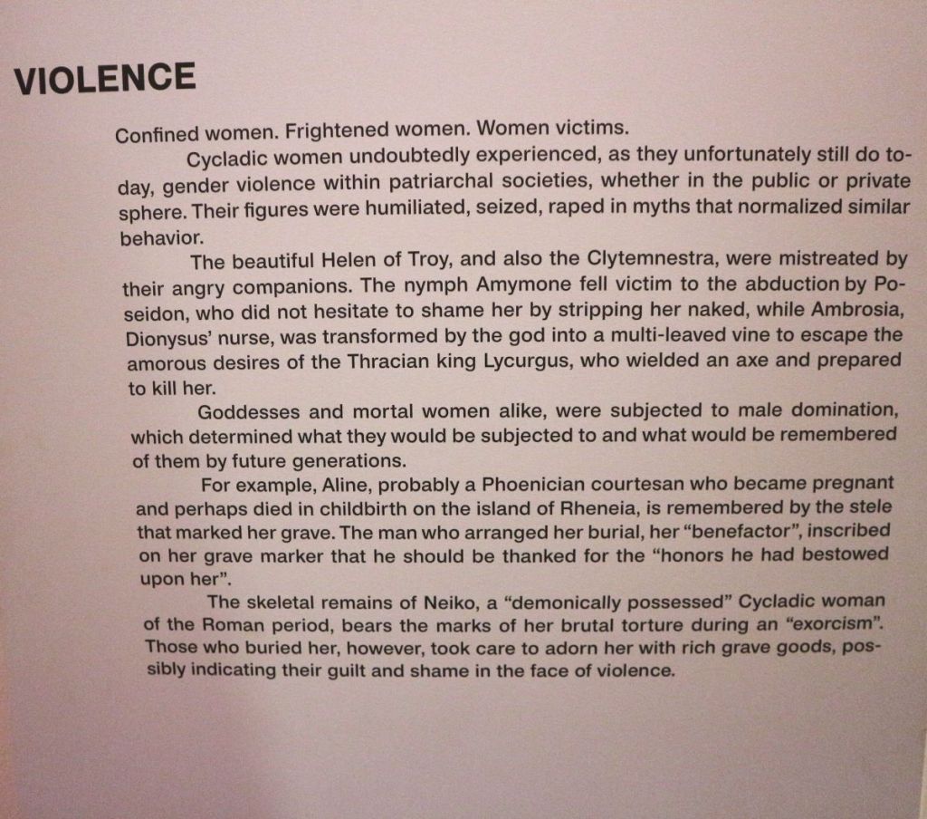 Mi ha fatto piacere – se così si può dire – trovare tra le varie sezioni, quella dedicata alla violenza subìta. La rappresentazione, cioè, della violenza sulle donne. E il pannello di sala è piuttosto efficace nella scelta delle parole. La propongo nell’immagine che segue:
