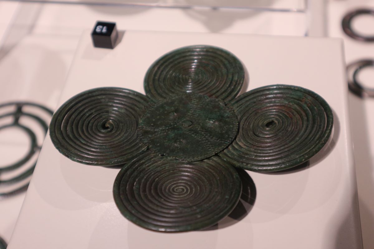 Un’altra sepoltura femminile da Guardia Perticara, in provincia di Potenza, è della prima metà dell’VIII secolo a.C.: in mostra è riproposta l’intera sepoltura, comprensiva dell’inumazione e dei gioielli in bronzo, ferro e pasta di vetro. La donna indossava una cuffia di bronzo. Vedremo nel prosieguo della mostra oggetti strepitosi in tal senso.