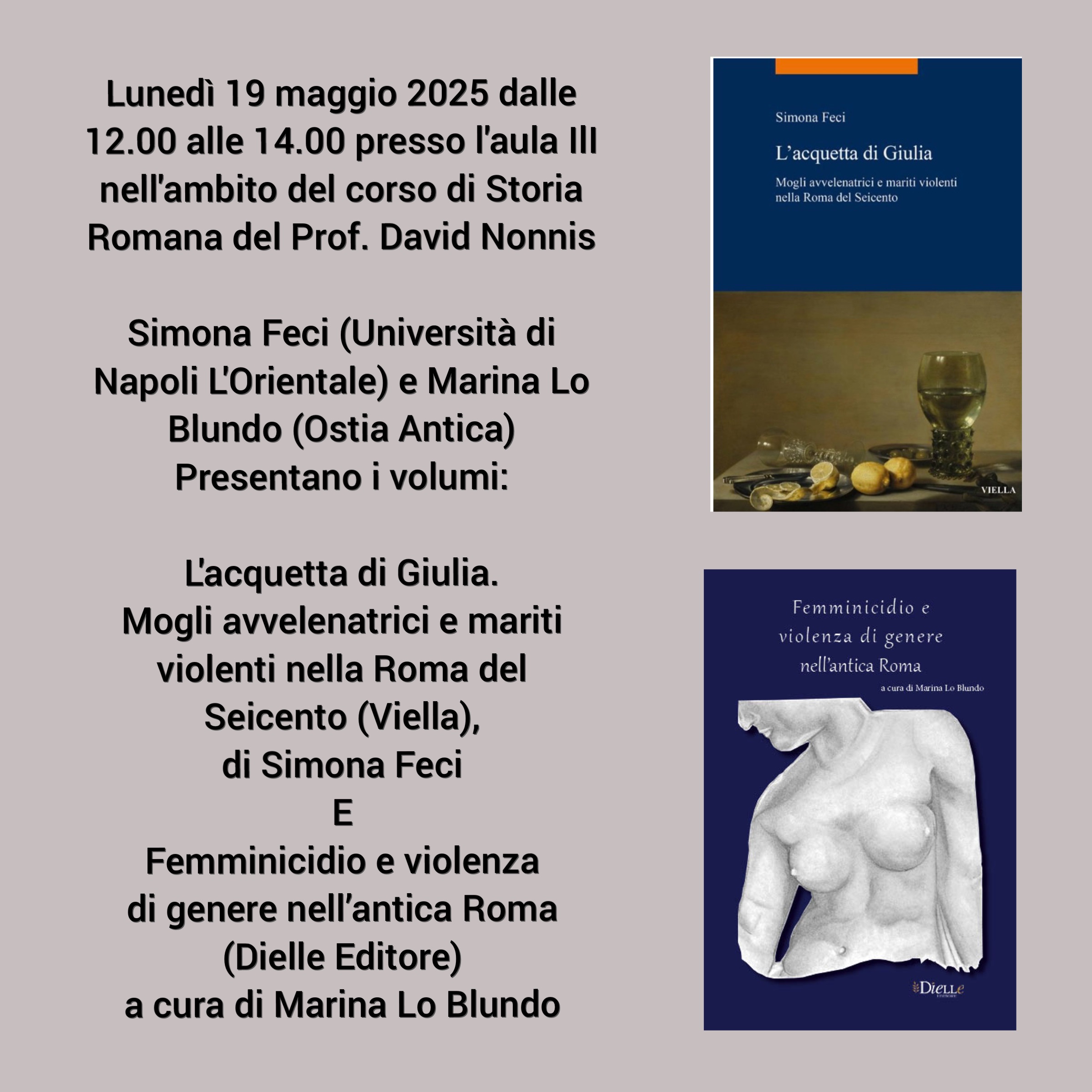 Il 19 maggio dalle ore 12 alle 14, nell’ambito del corso di Storia Romana del prof. David Nonnis si svolgerà una presentazione doppia: Silvia Feci (Università Napoli Orientale) autrice del saggio “L’acquetta di Giulia. Mogli avvelenatrici e mariti violenti nella Roma del Seicento” (Viella Editore) e Marina Lo Blundo (Parco archeologico di Ostia antica), curatrice del saggio “Femminicidio e violenza di genere nell’antica Roma” (Dielle Editore).