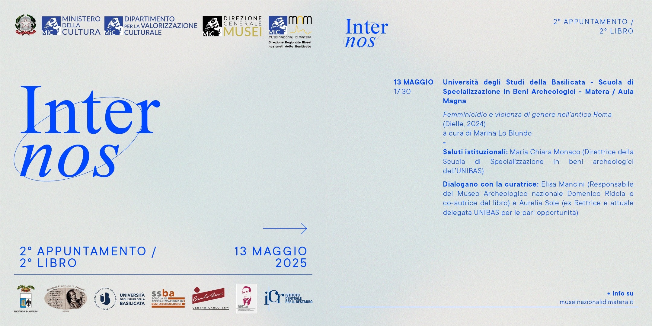 All’interno del ciclo di incontri “Inter Nos” organizzato dai Musei Nazionali di Matera, il 13 maggio si terrà la presentazione de volume “Femminicidio e violenza di genere nell’antica Roma” alle ore 17.30 presso l’Aula Magna dell’Università degli Studi della Basilicata – Scuola di Specializzazione di Matera.