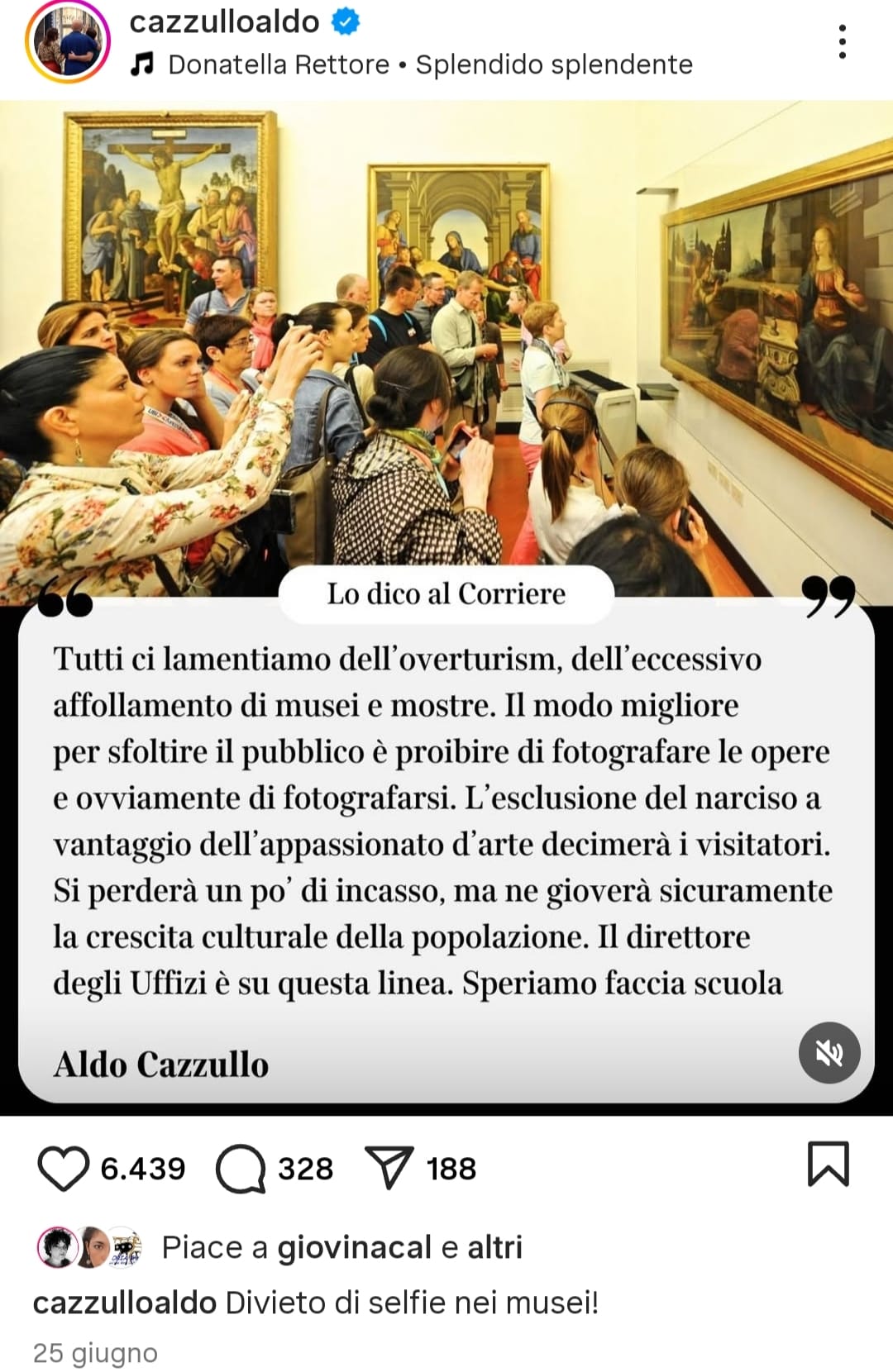 E’ evidente che in questo caldo luglio 2025 le notizie languono e bisogna trovare qualcosa di cui parlare. Già l’incidente degli Uffizi di qualche settimana fa, in cui un visitatore inciampandosi ha rovinato una tela esposta in una sala strapiena di altri visitatori, aveva fatto esprimere voci autorevoli della museografia italiana, quale quella stentorea di Aldo Cazzullo, sulla necessità di imporre il divieto di selfie e di fotografie nei musei.