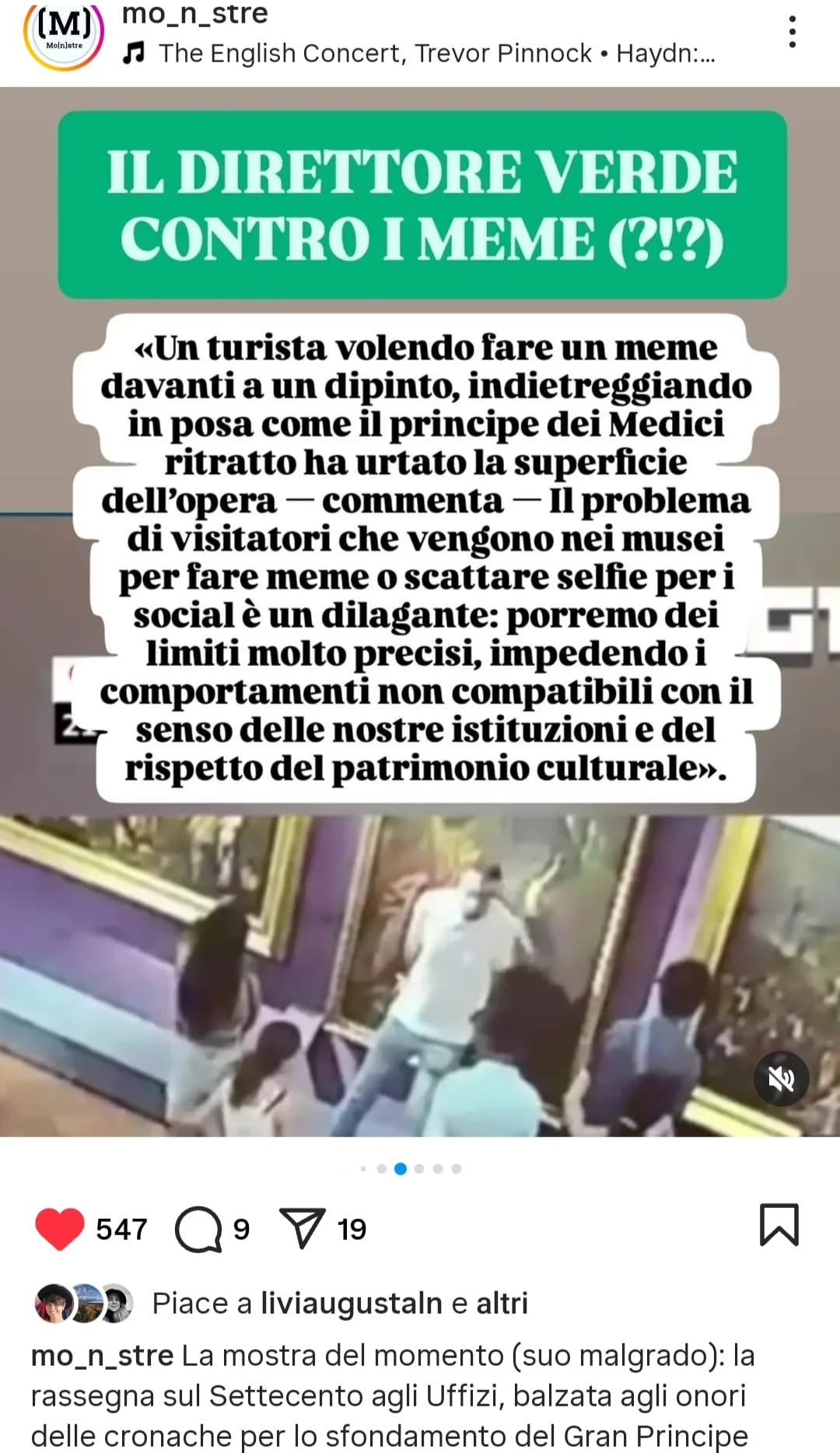 E prima ancora di lui, lo stesso direttore degli Uffizi Simone Verde il quale, invece di chiedersi come possa succedere che in una sala affollata un visitatore si inciampi danneggiando un’opera, aveva fatto un gran minestrone di meme e selfie, rovina dell’esperienza museale (molto ben chiosato da un meme – quello sì – di Monstre, sempre sul pezzo). Monstre che tra l’altro dedica un suo carosello proprio al sovraffollamento delle sale in relazione all’allestimento di quella specifica mostra.