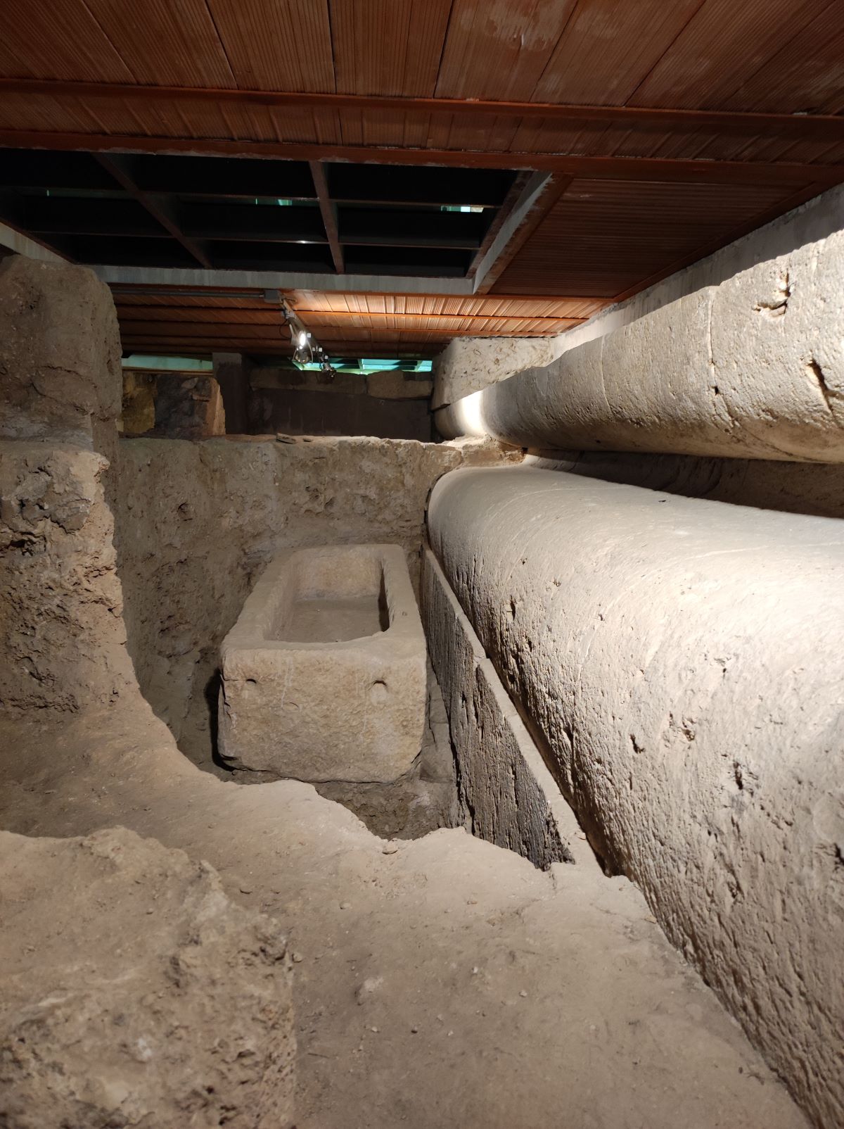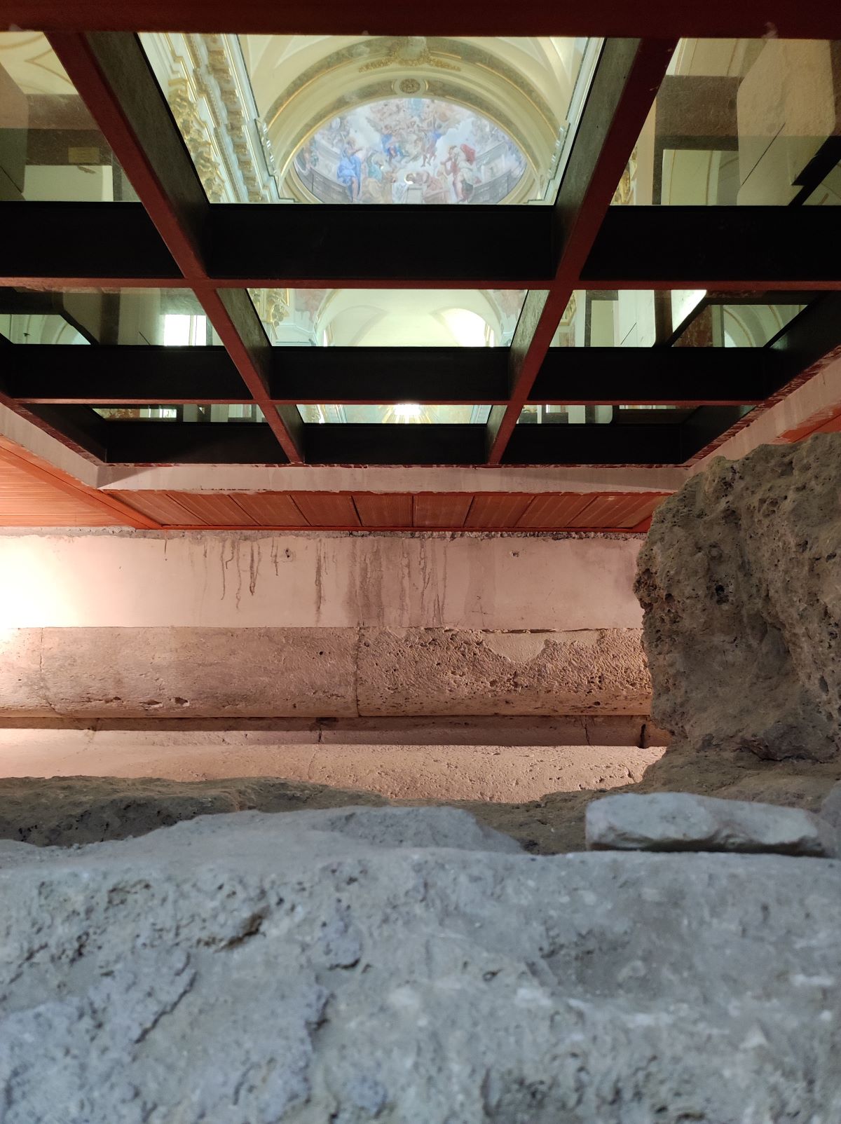 Il percorso di visita consente di percorrere tutto il lato lungo orientale del tempio maggiore, ma pure il lato corto settentrionale, quello di chiusura, nel quale si vede bene l’abside dell’edificio di culto paleocristiano che si impostò sul precedente grande tempio pagano. Da qui, tra l’altro, alcune “finestre” nel pavimento della chiesa soprastante consentono di capire dove ci troviamo rispetto al duomo attuale. E al tempo stesso chi è in chiesa vede sotto i suoi piedi una finestra aperta sul passato più antico dell’area. Nell’abside paleocristiano fu collocata una sepoltura che reimpiegava un sarcofago di età imperiale