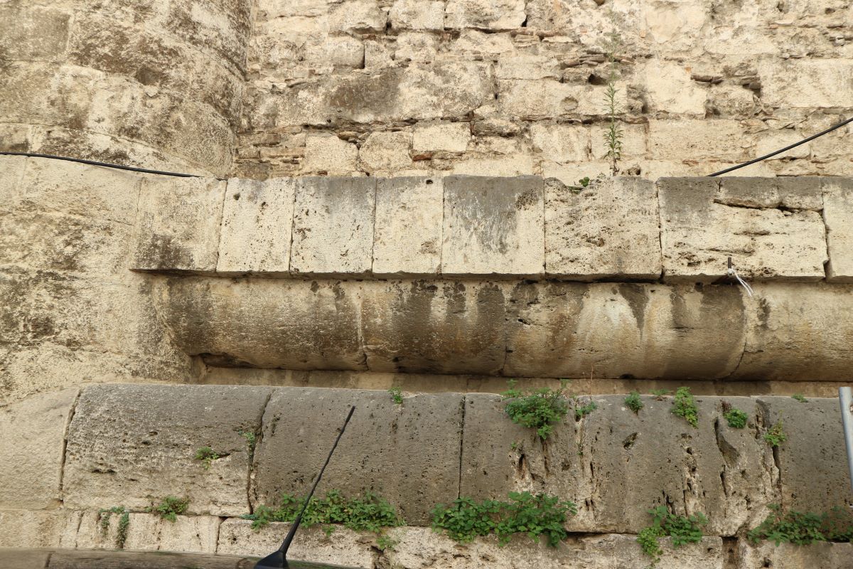 Già ridiscendendo Corso Marcelli a partire dalla piazza possiamo vedere, sulla destra, sul fianco del Duomo, strutture murarie che non lasciano adito a dubbi: il fianco del podio dell’antico tempio del III secolo a.C. fa bella mostra di sé, col suo profilo a doppio cuscino dato dalle due gole, dritta e rovescia, che ne compongono la cornice.