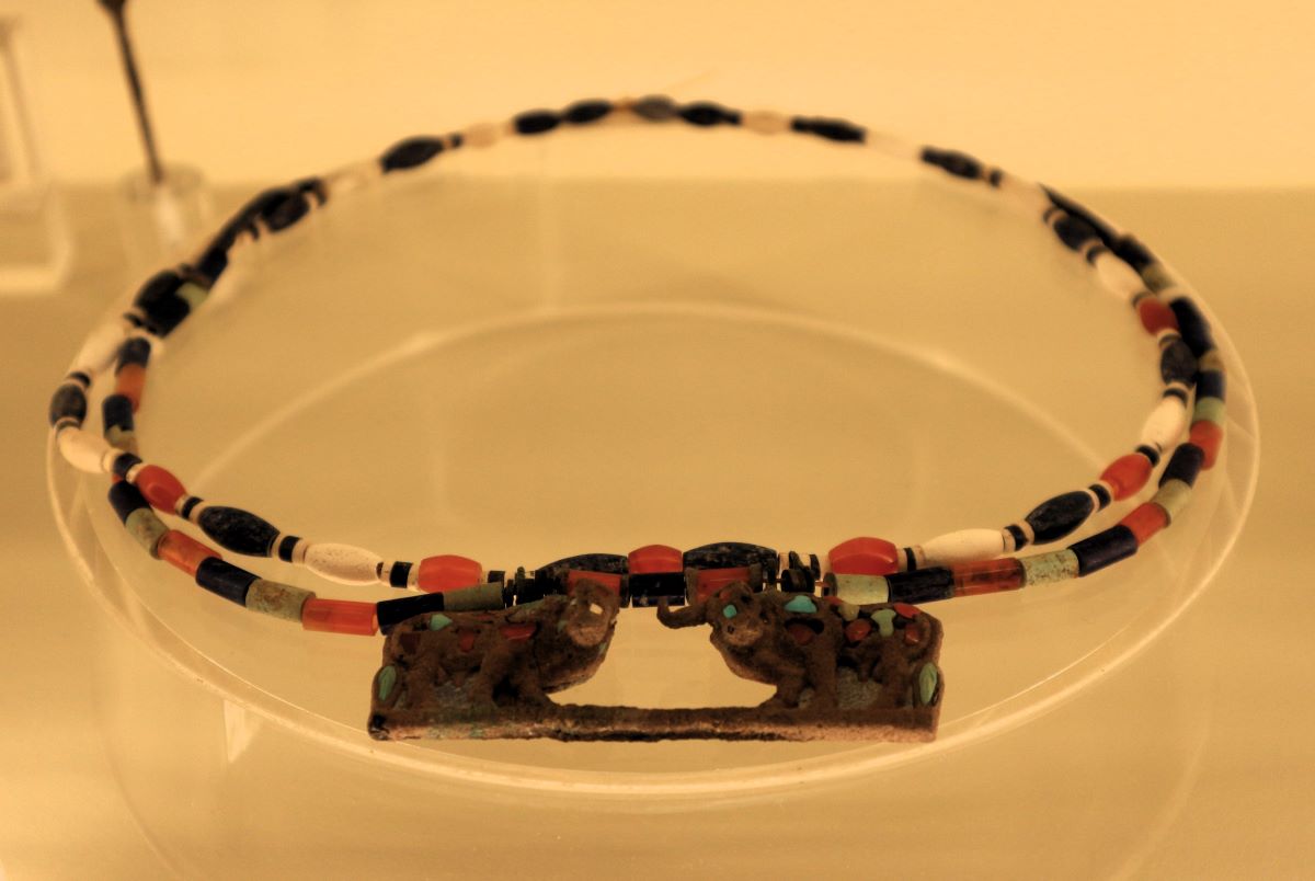 Dopo una prima sezione dedicata alla Margiana protostorica e alla sua cultura materiale (vasellame proveniente dal sito di Gonur Tepe, il più importante tra i siti protostorici del Turkmenistan), si passa alla rappresentazione del potere e del culto dei morti. In questa sezione, la gazza ladra che è in me non può non soffermarsi sui gioielli esposti: in perline, pietre preziose e oro, assolutamente moderni nelle loro forme: io personalmente non esiterei a indossarli. Sigilli in bronzo, pettorali, asce conformate a pesce sono gli oggetti status symbol del potere a Gonur Tepe, tra la fine del III e il II millennio a.C.