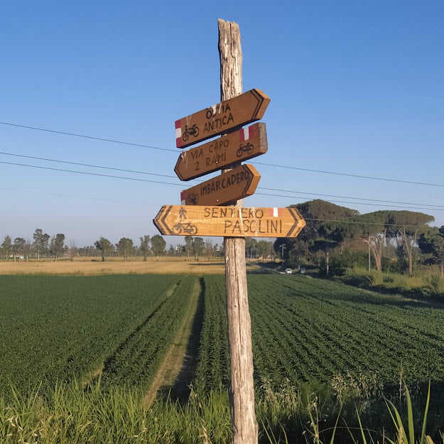 Per arrivare a Capo Due Rami occorre imboccare a piedi o in bicicletta l’argine che da qui risale percorrendo il Sentiero Pasolini. Dopo qualche km si arriva a una panchina che guarda effettivamente Capo Due Rami. Per me il modo migliore, da Ostia antica, di raggiungere questo belvedere è, dal borgo, imboccare via delle Saline, e procedere a diritto, uscendo dapprima dal paese imboccando una strada bianca e, all’incrocio con un’altra strada bianca, prendere la sterrata che prosegue dritto per dritto (come si dice a Roma). In 40-45 minuti di passeggiata a piedi attraverso campi coltivati magnifici, grazie ai quali si impara il ciclo delle stagioni, si raggiunge l’argine in corrispondenza di Capo Due Rami.