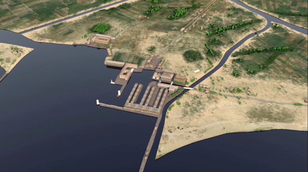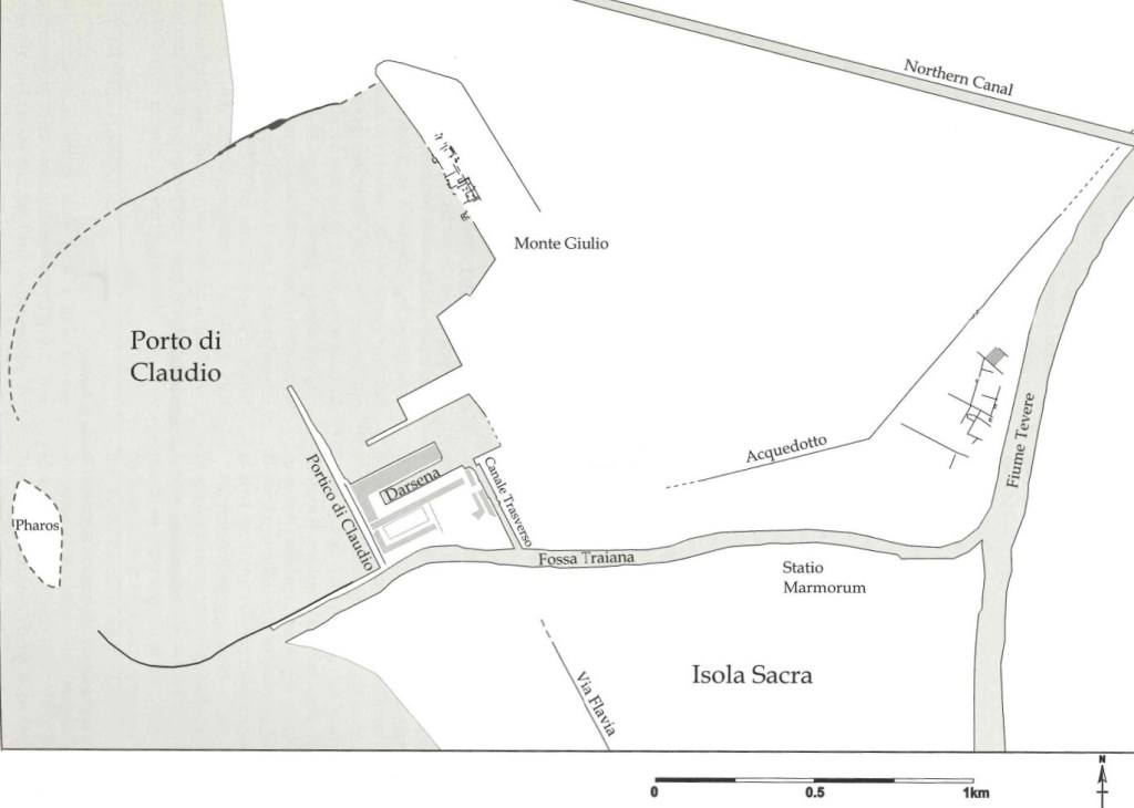 E Portus? Ho lasciato volutamente per ultimo il grande porto di Claudio e di Traiano. Il Canale di Fiumicino fu scavato proprio per collegare l’infrastruttura portuale, fatta di banchine e moli, ma anche e soprattutto di docks, di magazzini per il primo stoccaggio delle merci, al Tevere e dunque a Roma.